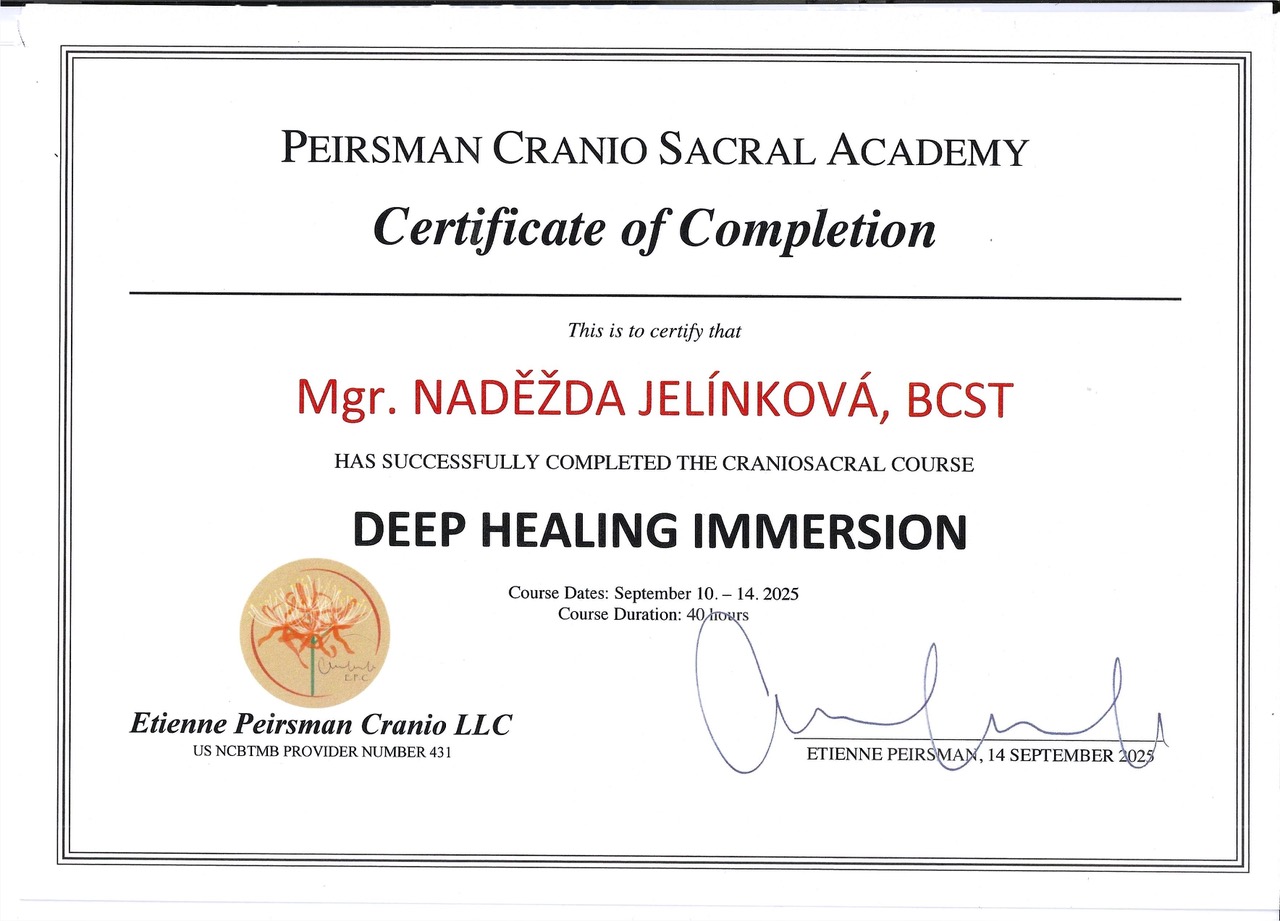 2016-2019 profesionální výcvik Kraniosakrální biodynamika/Craniosacral biodynamics, ICSB®, Bhadrena C. Tschumi, Kavi Allessandro Gemin (900 výukových hodin)